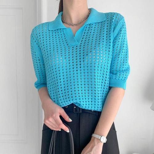 [다잇템]여자 펀칭 SS 반소매 오픈카라넥 비침 니트 (15258263A)