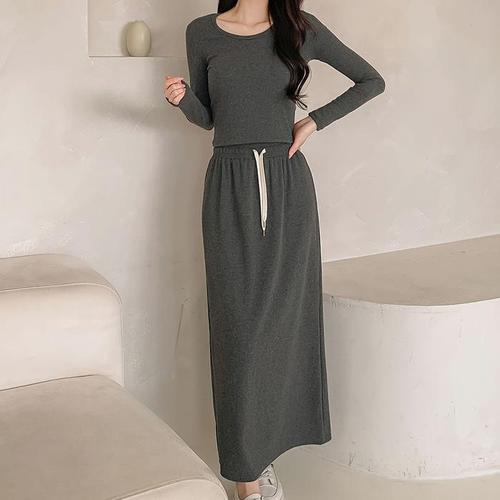 [다잇템]여자 골지 페미닌 긴치마 슬릿 롱슬리브티 세트 (29833638A)
