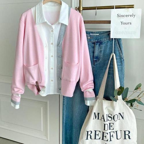 [신상오픈런]핑크가디건 배색 스트라이프 브이 봄니트 여성봄자켓 (31612820)
