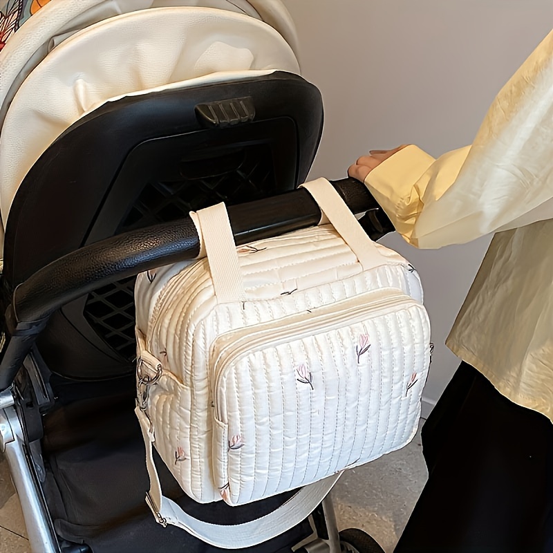 TEMU 시크한 곰 & 튤립 자수 기저귀 가방 - 유아 여행 필수품을 위한 나일론 크로스바디 부모 가방, 유모차 클립 포함