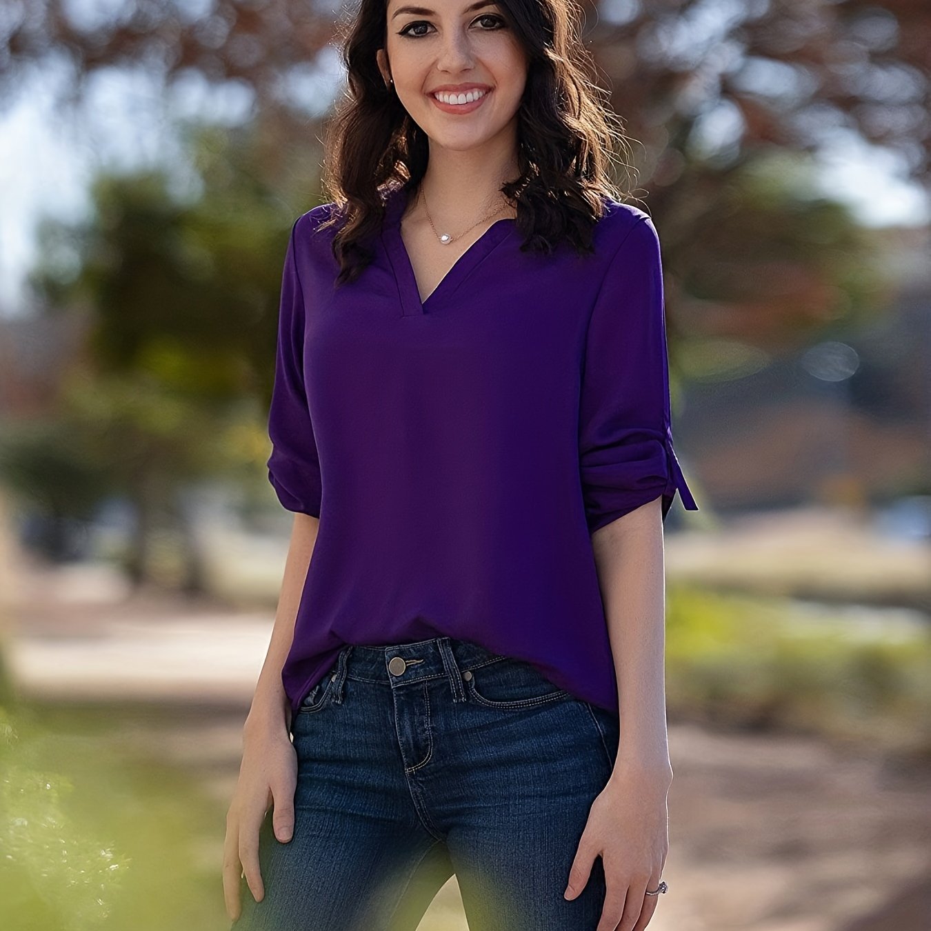 TEMU V넥 블라우스, 우아한 3/4 소매 레이스업 커프 탑, 봄 & 가을 여성 의류