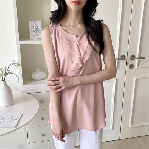 [다잇템]여자 진주 프릴 슬리브리스 버튼 U넥 블라우스 (9947282A)