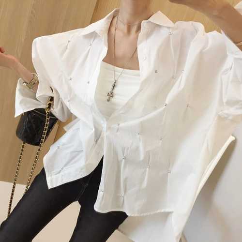 실버볼 찡 셔링 포인트 카라 오버핏 롱 언발 봄 셔츠남방