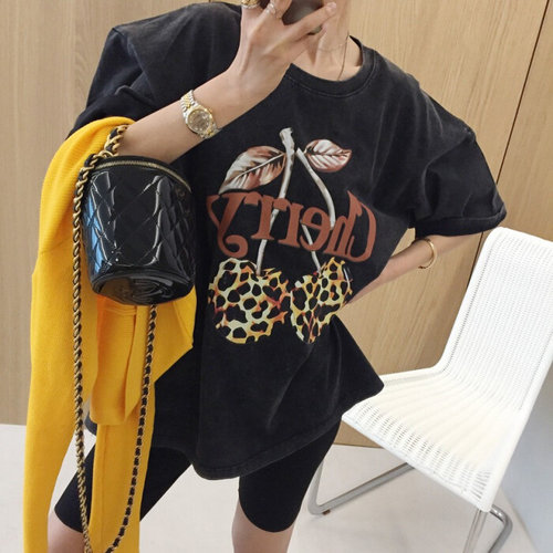 [셀럽하우스]여자 BDJO0915 라운드넥 체리 그래픽 면 소재 반팔 티셔츠