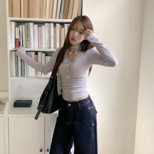 [옷자락] 여자 슬림 데일리 여리핏 레이스 초커넥 긴팔티