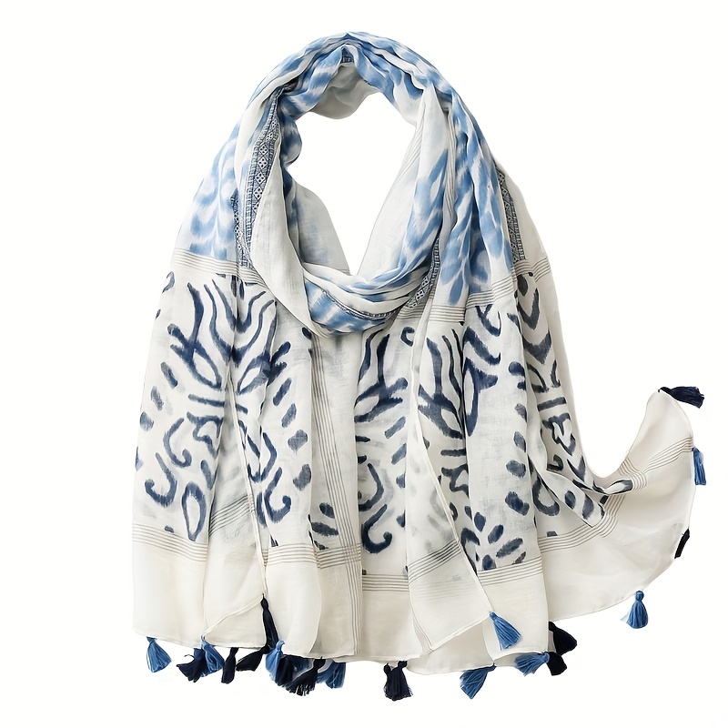 TEMU 여성용 스카프 - 엑스트라 롱 & 와이드 럭셔리 블루 프린트 (네이비) - 사계절 레이어링 숄 랩 - 세련되고 야생적인 일상 및 포멀 룩, 논 스트레치 우아한 랩, 프린지 디테일, 트렌디 스트릿 스타일, 가벼운 소재, 정교한 제작