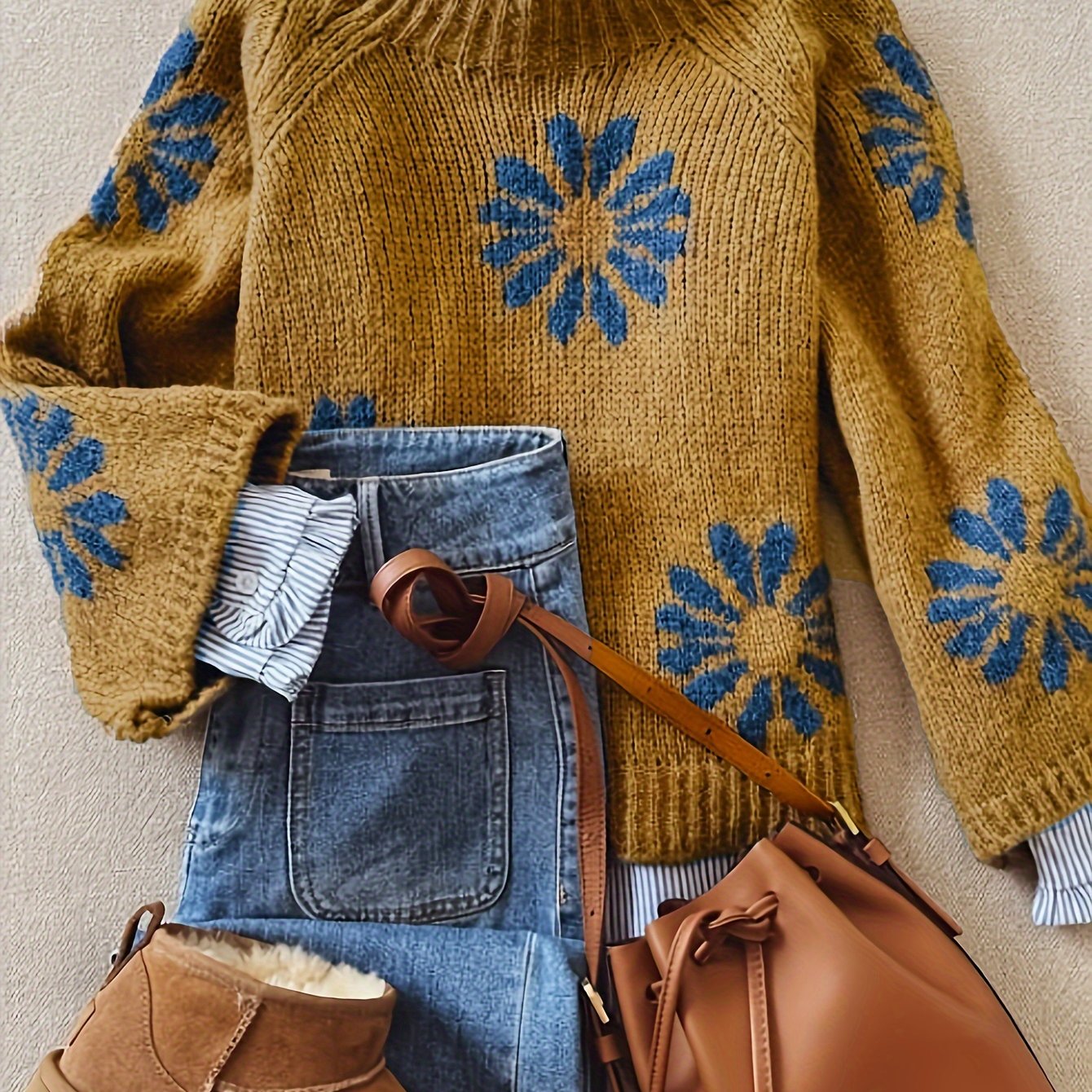 TEMU 꽃무늬 패턴의 세련된 여성용 상의, 긴소매, 하이넥 풀오버 스웨터