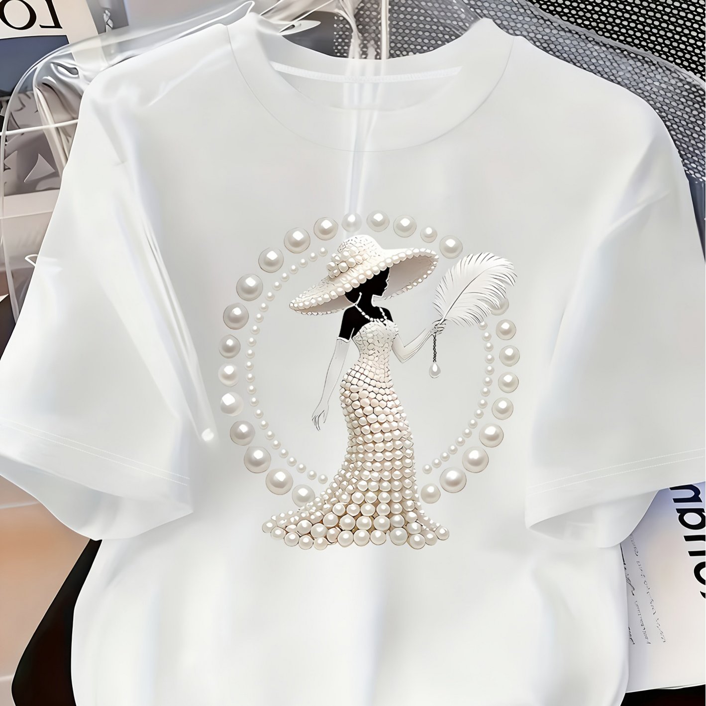 TEMU 펄과 라인스톤 장식이 있는 프린트 티셔츠. 부드럽고 통기성이 좋은 원형 넥과 반팔 디자인으로, 봄과 여름에 어울리는 세련된 캐주얼한 아이템입니다.