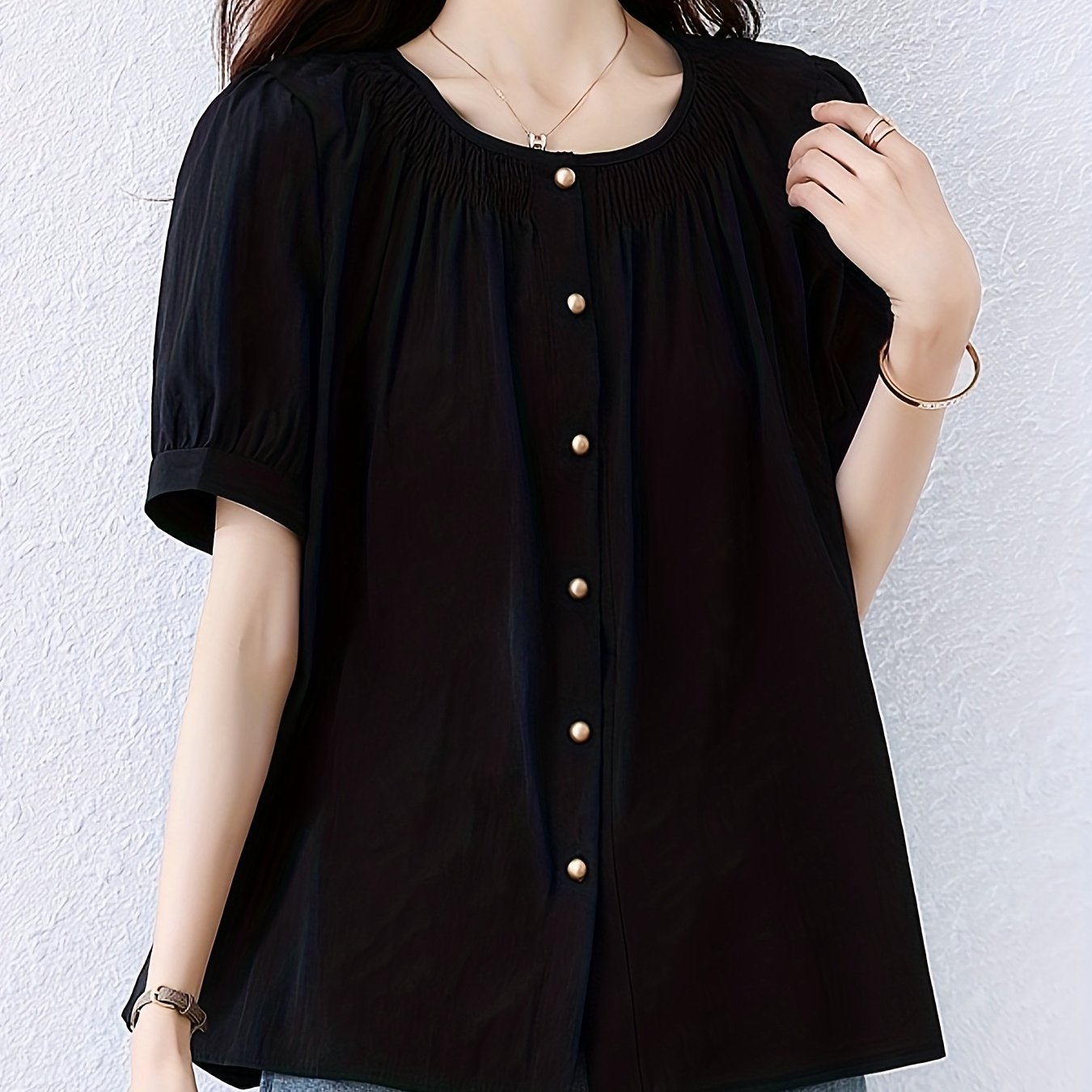 TEMU 여성용 우아한 슬리브 블라우스 - 단색 라운드넥 버튼업 셔츠, 사계절 캐주얼 & 포멀 웨어, 비침 방지, 핸드워시 전용, 고급스러운 스타일, 품질 좋은 소재, 클래식 디자인, 내구성 있는 재질, 오피스 여성복