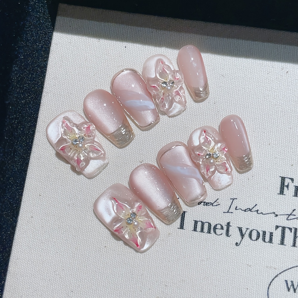 TEMU 10개입 짧은 사다리꼴 핸드메이드 누름식 인조네일, 우아하고 로맨틱한 손톱, 핑크 네일, 꽃, 가든 드림, 탈부착 및 재사용 가능, 젤리 접착제 1개 및 네일 파일 1개 포함, 일상, 직장, 학교, 데이트, 파티, 댄스에 적합
