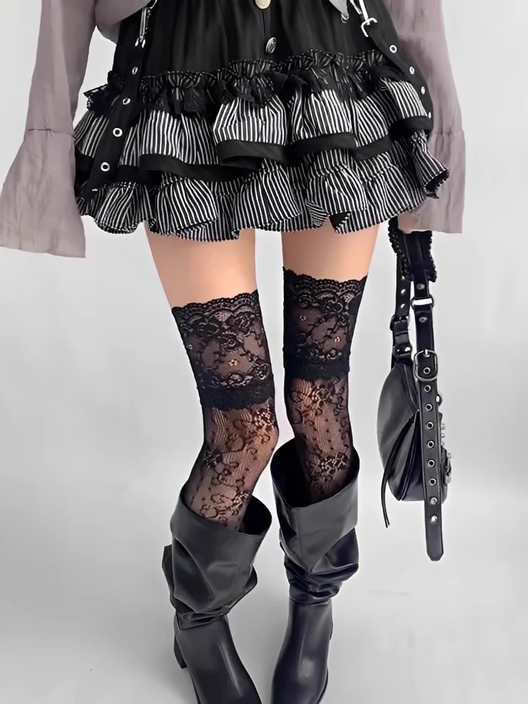 여성용 섹시한 레이스 꽃무늬 망사 스타킹 의상 Jk 로리타 허벅지 높이 양말 나일론 메쉬 통기성 무릎 위 트림 롱 양말