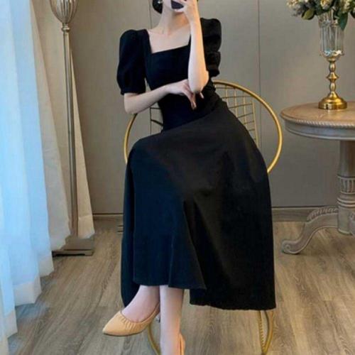 [오너클랜]인기상품 여름용 스퀘어넥 블랙 퍼프 반팔 롱 드레스 A라인 실루엣 [WFLLJ3E_260305]