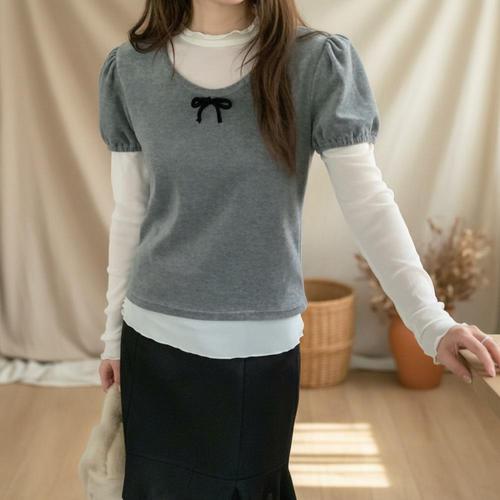 [옷자락] 여성 페미닌 리본 퍼프 반팔 티셔츠