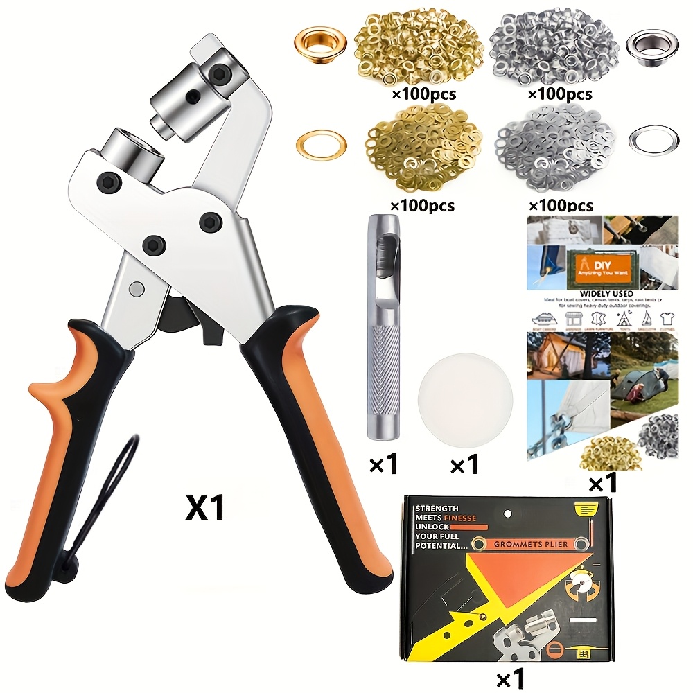 TEMU 휴대용 구멍 펀치 플라이어 아일렛 공구 키트 | 아일렛 프레스 플라이어, 휴대용 핸드헬드 아일렛 머신 (500개 3/8인치(10mm) 은색 아일렛 포함)