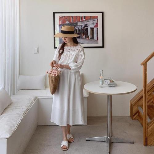 [다잇템]여자 레이스 고무줄 스퀘어넥 롱 펀칭 원피스 (10368178A)