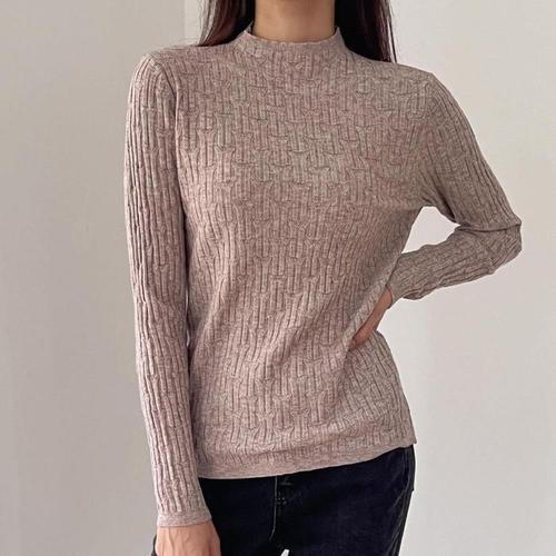 [다잇템]여자 폼폼 슬림 왕골지 미색 모크넥니트 티셔츠 (11149343A)