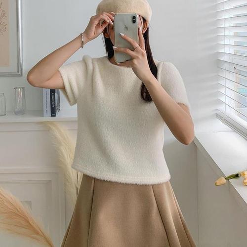[다잇템]여자 폼폼 슬림 왕골지 미색 모크넥니트 티셔츠 (11149343A)