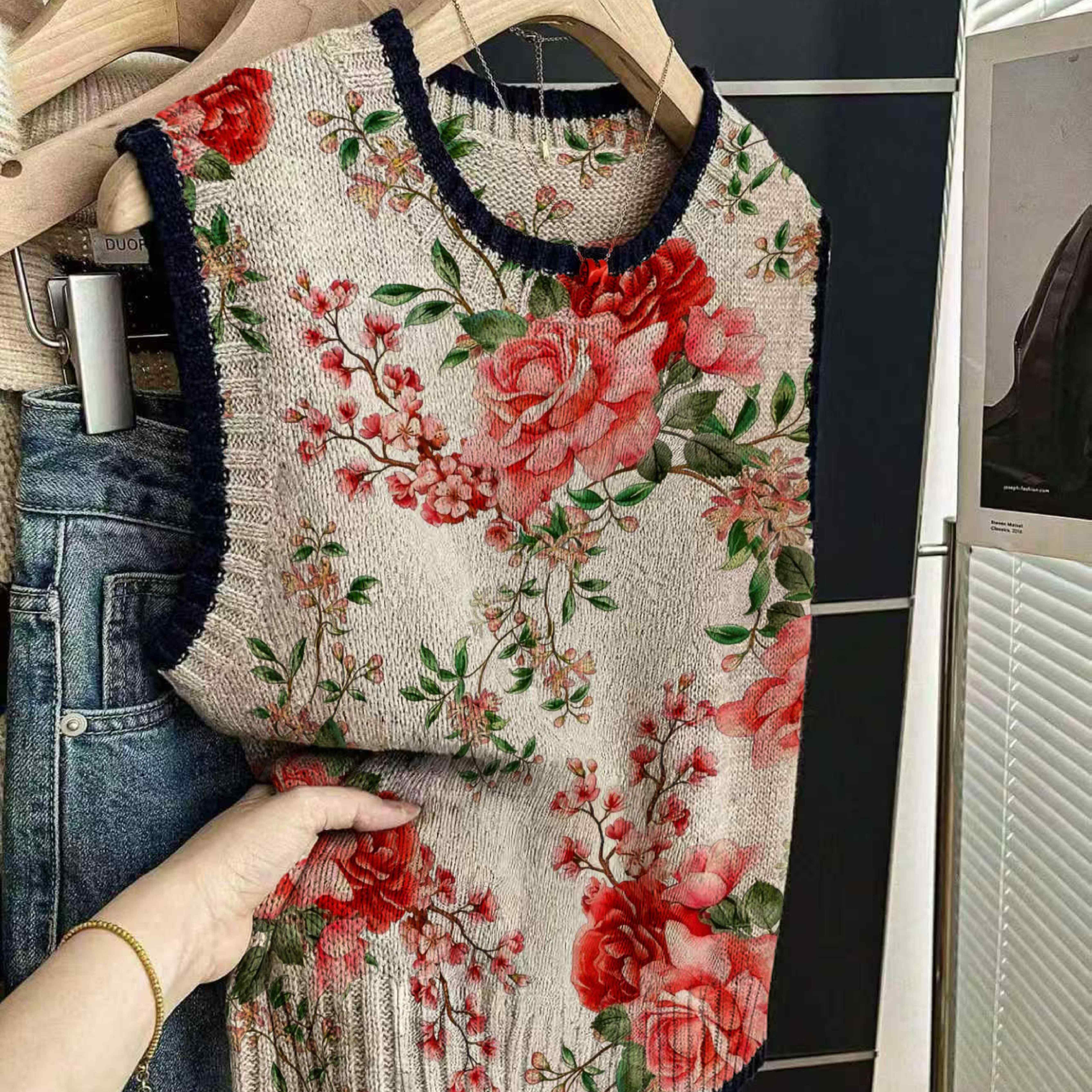 TEMU 다재다능하고 넉넉한 핏의 라운드넥 민소매 조끼입니다. 컬러 트림과 카키색 플로럴 프린트가 특징이며 가을/겨울 여성 패션에 완벽합니다.