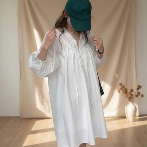 [옷자락] 여성 내추럴 무드 셔링 플레어 미니 원피스