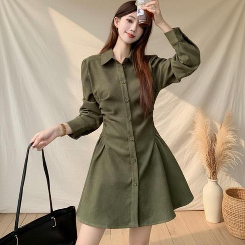 [옷자락] 여성 핀턱 셔링 허리 플레어 미니 원피스