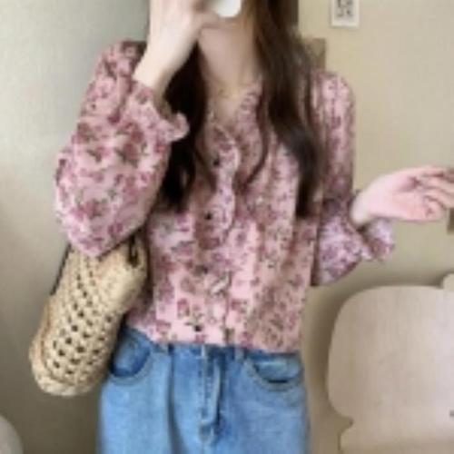 [다잇템]여자 프릴 꽃무늬 롱슬리브 카라없는 블라우스 (11308108A)