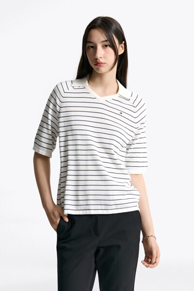 여성용 신상 트렌디하고 세련된 분위기의 니트 스트라이프 풀오버 긴팔 브이넥 슬림핏 여성 티셔츠