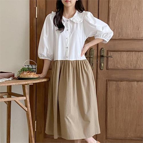 여자 봄 데일리 화이트 차콜 퍼프소매 절개 롱원피스