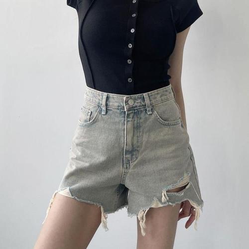 아브릴 여성데님반바지 빈티지 워싱 대미지 5부 데님 반바지 여름 하이웨스트 하프 바지 힛템
