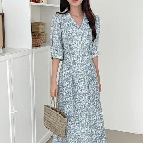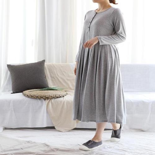 [다잇템]여성 버튼카라 후레아 잔주름 하프 롱원피스 (10379233A)