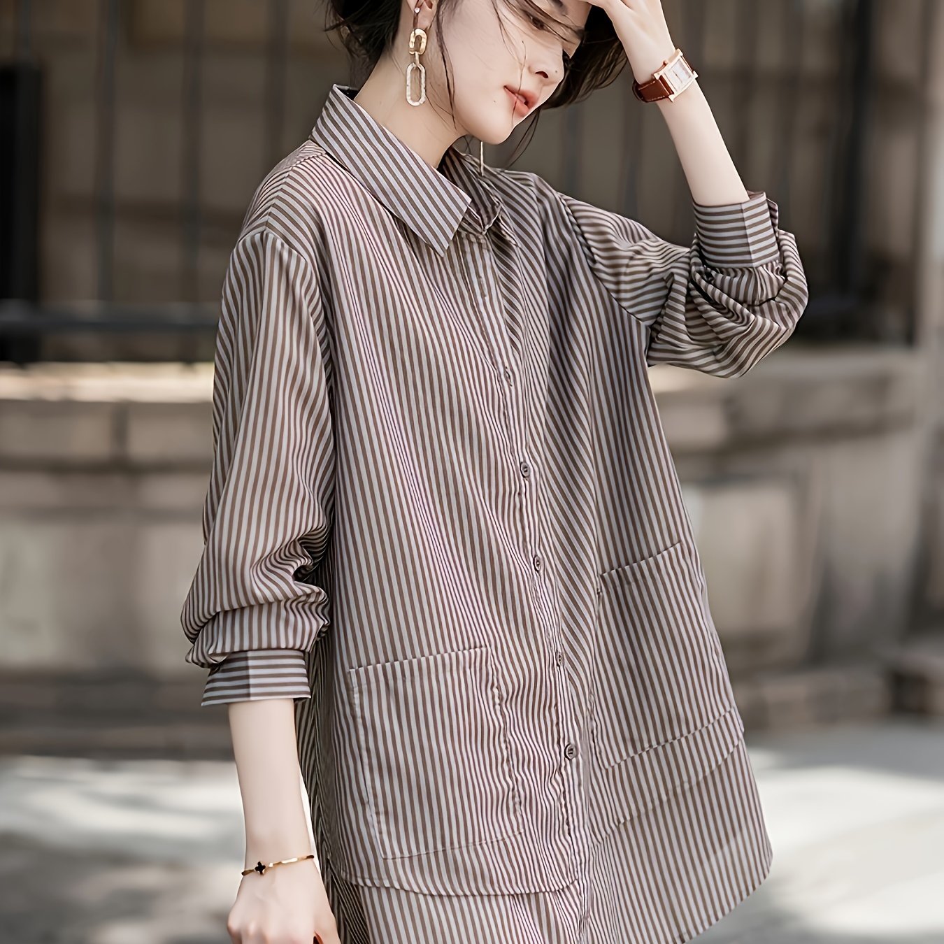 TEMU Plus Size, 2025 Fall Turn- Collar Loose Fit Versatile Striped Casual Comfortable Commuter Top Plus Size Women's Clothing