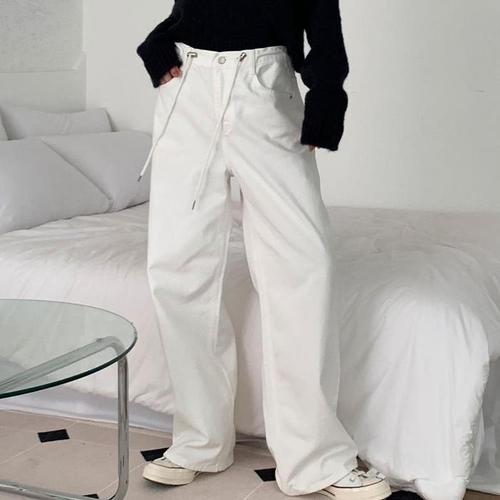 [다잇템]여자 흰색 넓은 롱 고무줄 드로우코드 팬츠 (10720875A)
