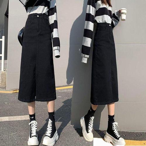 율랑팡 여성 A라인 블랙 스커트 가을 빈티지 슬림핏 트임 HO3