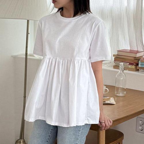 [유야]면 라운드 셔링 프릴 반팔 티셔츠 -TS0800H- 빅사이즈 루즈핏 여성 여름