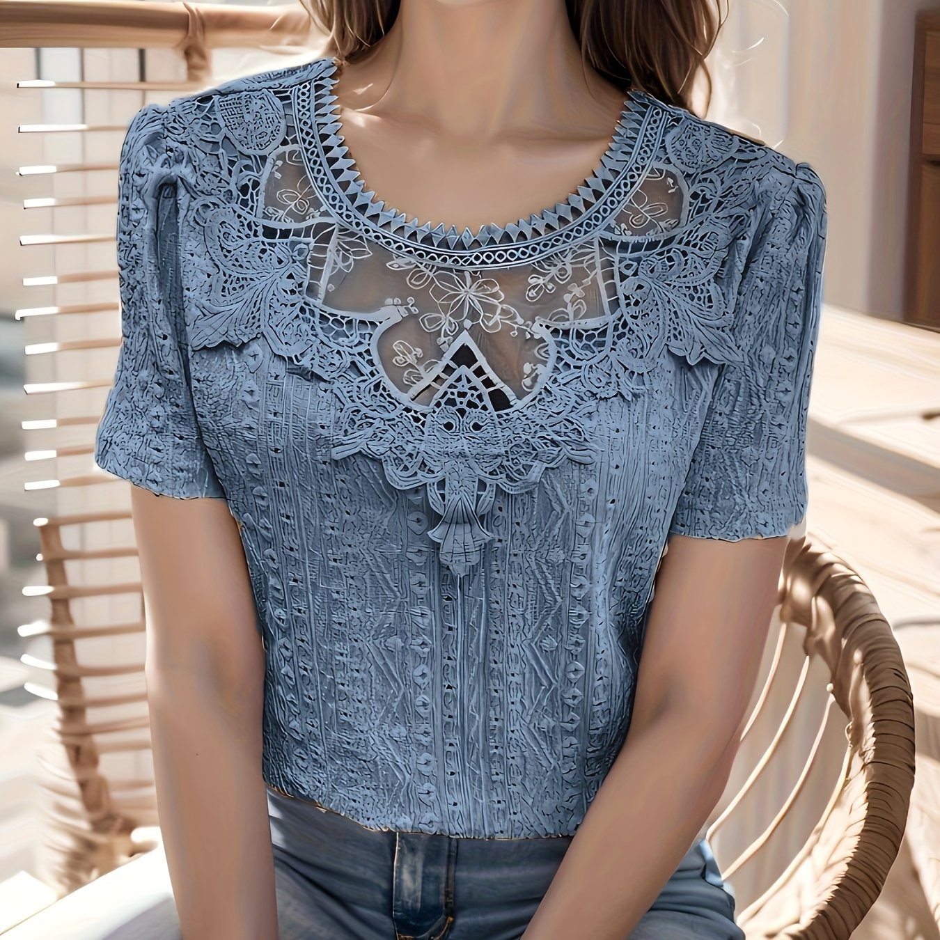 TEMU 우아한 여성 플로럴 반투명 레이스 소매 셔츠 - 3/4 소매 라운드넥 반팔 탑, 가볍고 세탁기 사용 가능, 봄, 여름, 가을에 적합, 캐주얼 및 포멀한 행사 모두에 적합