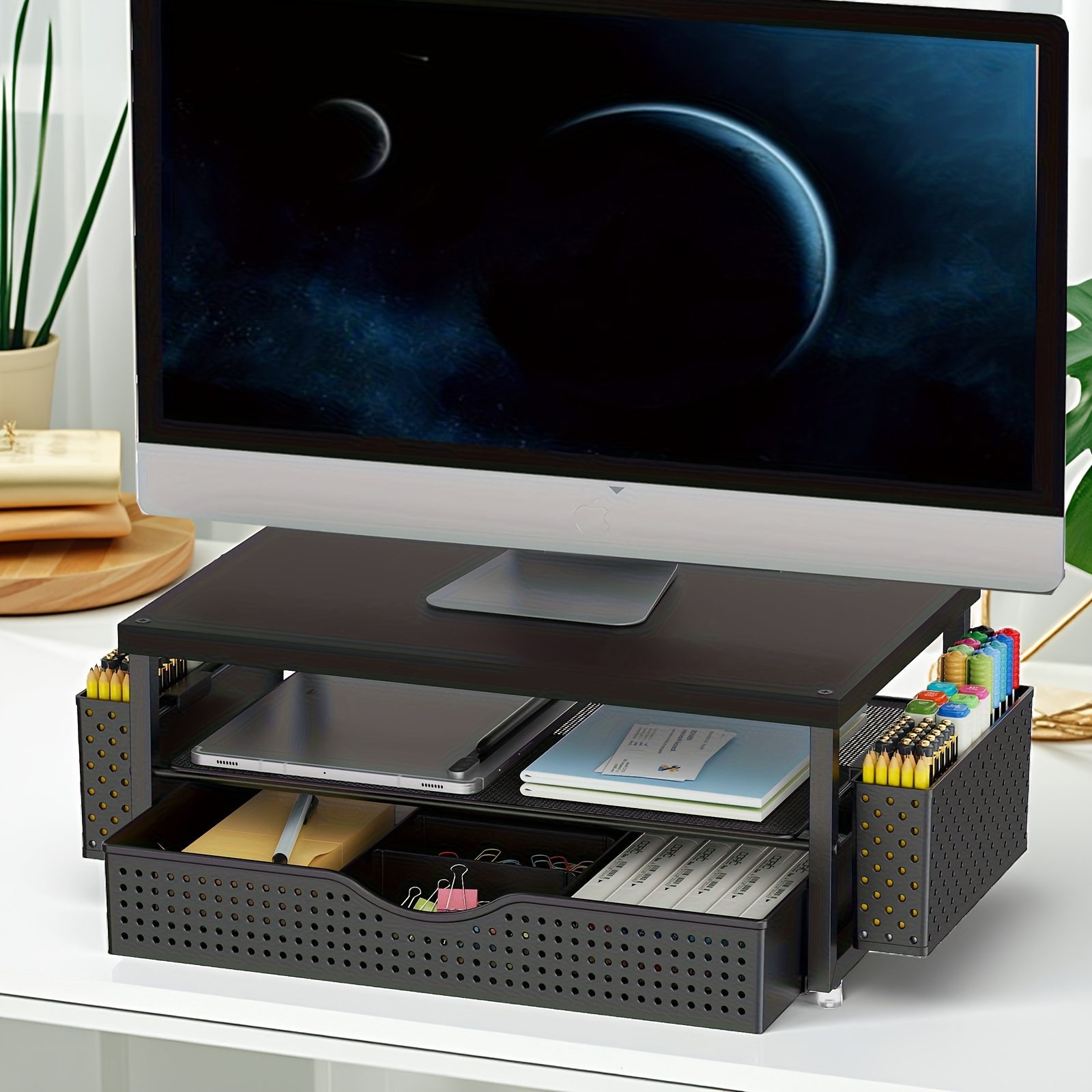 TEMU 스타일 모니터 스탠드 (서랍 및 사이드 펜 홀더 포함), 홈오피스/게이밍 세트업용 데스크 정리대, 컴퓨터 모니터 스탠드, 사무용품 및 액세서리, 전문가를 위한 깔끔한 전자제품 및 문구류